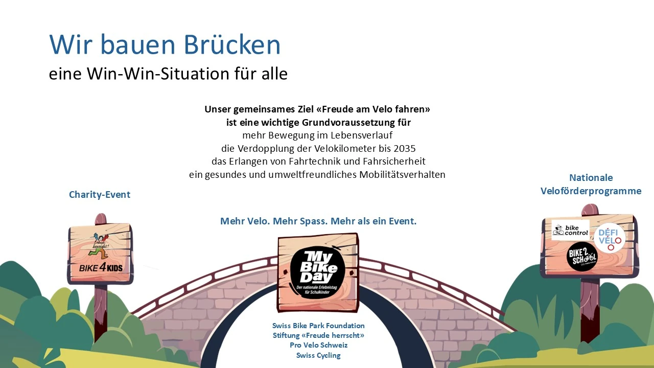 Der MyBikeDay ist der gemeinsame Höhepunkt der drei nationalen Veloförderprogramme Bike2school, bikecontrol und DEFI VELO. Was als Abschlussevent von Bike2school begonnen hat, ist heute ein inklusiver, erlebnisreicher Velo-Tag für rund 30 Klassen aus der ganzen Schweiz.